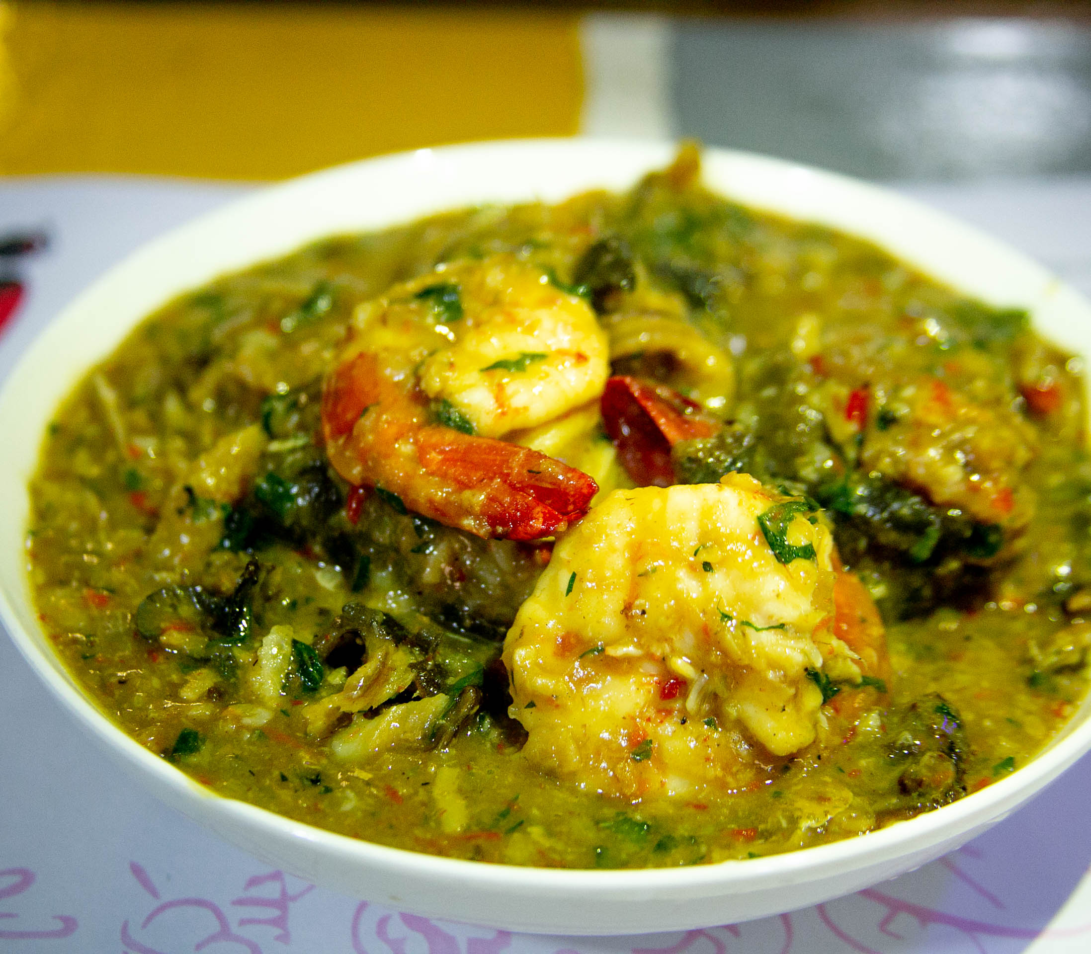 Ofe Nsala popularly known as ‘White Soup’ is a popular delicacy native to the Igbo tribe of Eastern Nigeria. It is called White Soup because it is prepared without (Palm) oil which typically gives soups a yellowish to reddish tinge. This soup comes standard with 2 Tiger Prawns, 2 Snails, Cow skin, pieces of stockfish and your choice of protein(s).